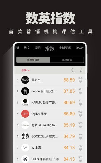 入駐近萬家企業(yè)帳號基于在數(shù)英平臺的活躍度、項目數(shù)、項目品質(zhì)、人氣、行業(yè)認(rèn)可度等多維度數(shù)據(jù)綜合得出的指數(shù)型工具。代理商指數(shù)用以評估代理商的綜合實力,品牌指數(shù)用以量化評估品牌在創(chuàng)意、營銷層面的聲量與表現(xiàn)。