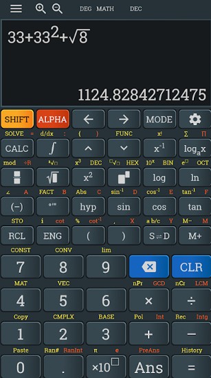 5.可以像一般實(shí)體科學(xué)計(jì)算器一樣使用(支持常規(guī)算術(shù)計(jì)算,百分比計(jì)算,根冪計(jì)算,倒數(shù)、常數(shù)、重復(fù)計(jì)算,支持對數(shù)指數(shù)、三角函數(shù)、雙曲函數(shù)、階乘與排列計(jì)算,支持二、八、十六進(jìn)制、邏輯運(yùn)算,支持RPN 模式和堆棧運(yùn)算,等等)