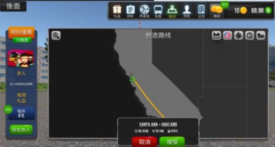 如果我們是剛開始玩這款游戲的話,只有幾條路線供我們選擇,所以大家也不要灰心喪氣,越到后面供我們選擇的路線越多,當(dāng)然我們的大巴也會變得越好。我們想走那條路線直接點擊路線,再點擊下面的接受就能開始我們的拉客之旅了,是不是非常簡單呢?