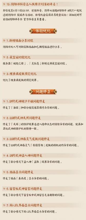 陰陽(yáng)師3月27日更新了什么?今天陰陽(yáng)師進(jìn)行了全新的版本更新,今天早上7點(diǎn)30-9點(diǎn)進(jìn)行停服更新,玩家們?cè)谶@個(gè)期間是無(wú)法進(jìn)入游戲的,在完成維護(hù)后玩家們上線是可以領(lǐng)取到停服補(bǔ)償?shù)?,且這次的更新為玩家們帶來(lái)了很多的活動(dòng)和獎(jiǎng)勵(lì),將會(huì)在后買(mǎi)幾天陸續(xù)開(kāi)啟,屆時(shí)玩家們可以前往活動(dòng)界面進(jìn)行參與,還有全新的式神上線,玩家們可以前往游戲召喚處進(jìn)行召喚,在第幾次召喚到要看各位的運(yùn)氣了,在達(dá)到一定次數(shù)后是必能獲得全新式神的!