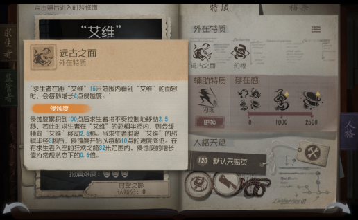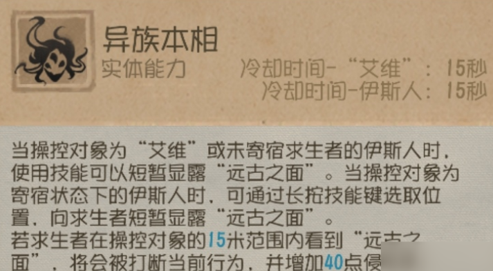 零階技能異族本相,這個(gè)是艾維增長(zhǎng)侵蝕度的一個(gè)重要手段,因?yàn)橐壳笊呖聪蜃约洪L(zhǎng)侵蝕度要30秒左右,注意是玩家的操作視角出現(xiàn)新監(jiān)管,而不是操作求生者的面相視角。但主要長(zhǎng)侵蝕度通過(guò)此技能的話,還是得通過(guò)精神體,這監(jiān)管要是沒(méi)有精神體幫忙抓人的話,追擊就會(huì)很弱,因?yàn)榍笊甙l(fā)現(xiàn)是新監(jiān)管了,都選擇直接純度寶典,特別是會(huì)馬拉松的求生。
