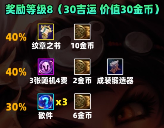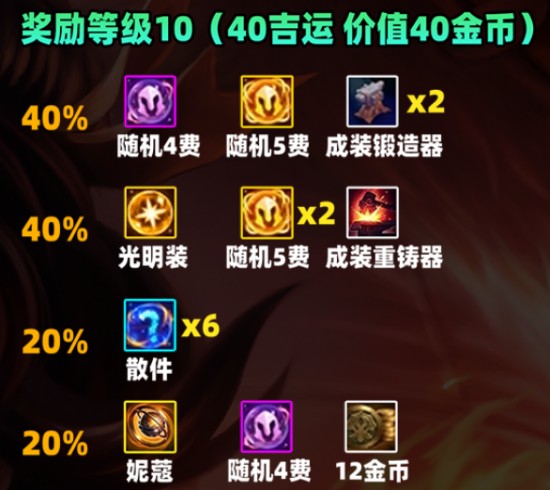 40%:金鏟鏟冠冕x2 + 3星隨機(jī)3費(fèi)弈子x2 + 10金幣 +裝備拆卸器