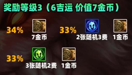 33%:隨機(jī)3費(fèi)弈子 + 隨機(jī)3費(fèi)弈子 + 隨機(jī)3費(fèi)弈子 + 3金幣(按價(jià)值應(yīng)該是7金幣)