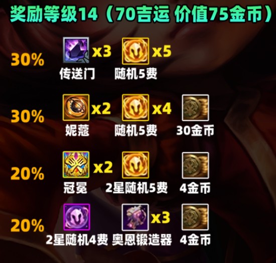 30%:英雄復(fù)制器x2 + 隨機(jī)5費(fèi)弈子x4 + 30金幣
