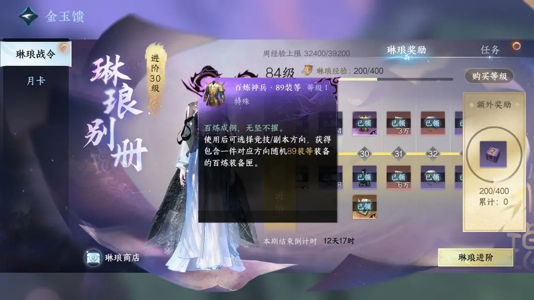 達(dá)到瓊玉一階,各位同門便可拿到百煉裝備,最多可通過段位玩法獲得兩件百煉裝備。當(dāng)前段位將于5月12日結(jié)束,還未達(dá)成的同門請抓緊時(shí)間。