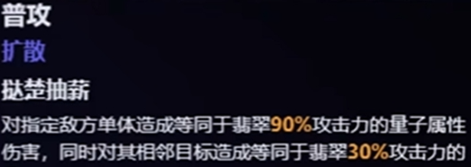 普攻對(duì)指定敵人和相鄰敵人分別造成90%和30%攻擊力的量子傷害。