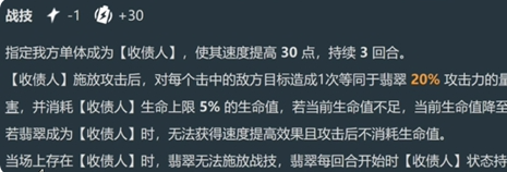 戰(zhàn)技會(huì)指定我方一個(gè)單位成為【收債人】,使其速度提升30點(diǎn),且攻擊攜帶翡翠20%攻擊力的附加傷害,但會(huì)消耗收債人5%的生命值,生命值不足時(shí)變?yōu)?點(diǎn),持續(xù)三回合。