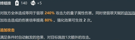 大招對(duì)敵方全體造成240%攻擊力的量子傷害,且獲得兩次使追加攻擊倍率提升80%的提升。