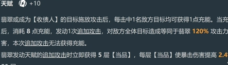 翡翠發(fā)動(dòng)追加攻擊時(shí),獲得5層【當(dāng)品】,每層獲得2.4%爆傷,最多能疊到50層。