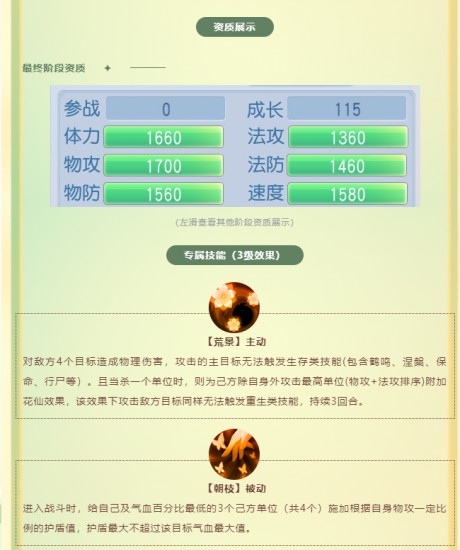 北斗是一只三星赤獸,以其高超的拳術和獨特的戰(zhàn)斗風格而聞名。它擁有專屬技能“碎拳”,能夠對單個目標揮出兩拳,第一拳施加碎甲狀態(tài)降低敵人物防,持續(xù)3回合。第二拳則將碎甲狀態(tài)轉移至敵方隨機一名角色,重置為3回合。若第一拳擊殺目標,則第二拳對敵方氣血最低的單位出拳。而碎甲數(shù)值與力量點數(shù)有關(不包含裝備、星魂及法陣)。該技能無法吸血。