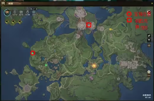 4、位置分別:右上角第一個坡上、右下角城中、地圖中間孤島、地圖左下角聚落,以及地圖上方城池門口。