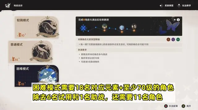 培養(yǎng)角色推薦:首先要說明的是,一般玩家尤其是萌新,個人依舊更推薦按照常規(guī)思路培養(yǎng)角色。推薦等到角色和資源多起來以后,再為新深淵做打算。因為困難模式需要18名對應(yīng)元素且至少70級的角色,除去6名試用和1名助戰(zhàn)角色,還需要11名角色。