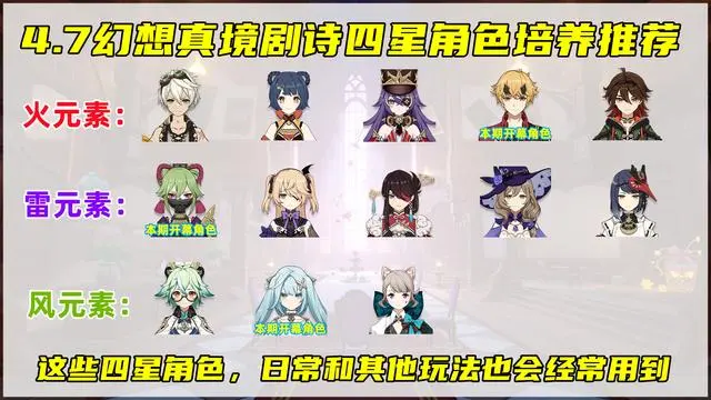 對應(yīng)元素的五星角色基本上都可以培養(yǎng);這里主要推薦日常和其他玩法也會經(jīng)常用到的四星角色(如果有的話)。火元素包括:班尼特、香菱、夏沃蕾、托馬、嘉明;雷元素包括:久歧忍、菲謝爾、北斗、麗莎、九條裟羅;風(fēng)元素包括砂糖、琺露珊、琳妮特。其中托馬、久歧忍和琺露珊是本期的開幕角色,因此可以先練其他的。