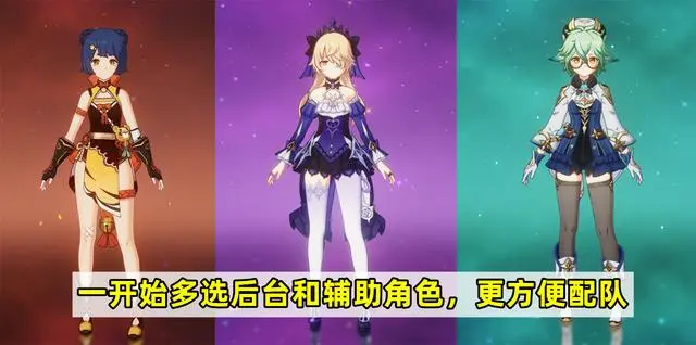 后臺和輔助角色更好配隊:我們在一開始選擇角色的時候,推薦先考慮可以在后臺打傷害、或者是能給隊友提供增傷/護盾/回血的輔助會更好配隊,比如香菱班尼特菲謝爾等,或者多選一些風(fēng)系角色,帶上四風(fēng)套提供減抗。需要站場的主C角色保證至少有四個即可,因為每個角色能上場兩次,總共8關(guān)挑戰(zhàn)。