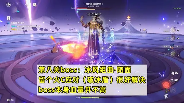 第八關(guān)的boss是冰風(fēng)組曲·陽面,進戰(zhàn)一段時間后會開啟冰盾,火、雷和荒性攻擊都能破盾。最推薦用火元素角色破盾,所以大家記得留個火C給第八關(guān),比如仆人。加上boss血量并不高,解決了破盾問題以后,剩下的就不難了。