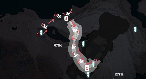 圖中小草標記代表點位,標記旁的數(shù)字代表該點位的龍吐珠總數(shù);由于游戲內(nèi)無法近距離標記,圖中添加了白底紅字的標記,同時表示位置及數(shù)量。