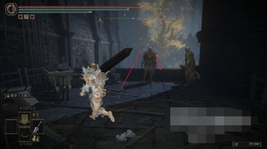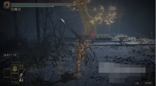 4、可以看到底下有一個(gè)黑騎士在等待著我們,前方黃金樹的旁邊即可拾取【王受賜護(hù)符】。