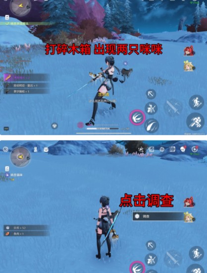5、跟隨指引打碎木箱,就會(huì)出現(xiàn)兩只小貓,靠近小貓后點(diǎn)擊調(diào)查;