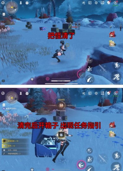 4、來這里后先把怪給清掉,等清完后,開箱子就可以出現(xiàn)任務(wù)指引;