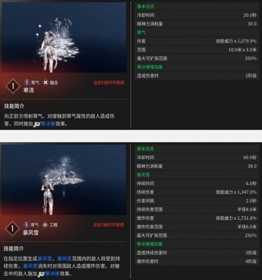 ③寒流(融合):向前方噴射出扇形寒氣,對(duì)敵人造成傷害并施加寒冰鐐效果。
