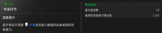 傳染鏈:提升相當(dāng)于弗蕾娜技能中毒狀態(tài)敵人數(shù)量的毒屬性技能威力。
