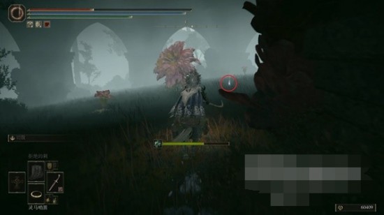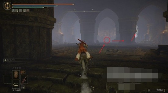 5、此處可以看到左右兩邊各有一個圓形建筑,我們往左側(cè)的那一個走,中間雕像的位置可以撿到一個【靈灰】。