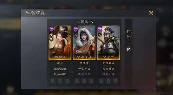 【閉月】:減少25%異性傷害(受最高屬性影響),每次回合結(jié)束后,為友方最高武力兵刃傷害增加15%,并針對(duì)該回且攻擊過貂蟬的目標(biāo)造成45%無視統(tǒng)率的兵刃傷害(不會(huì)觸發(fā)暴擊)。