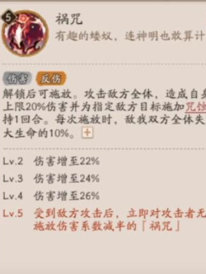 【咒紗】:【通用,印記】上限7層;自身受到單體傷害時,減少1層對全體敵方造成此傷害20%的真實傷害(不觸發(fā)敵我雙方的御魂與被動)層數(shù)歸零后,效果抵抗提升100%并解鎖【禍咒】。