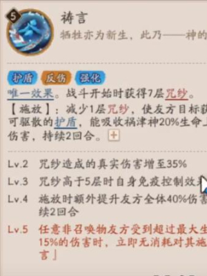 施放技能時減少1層 咒紗 ,使友方目標(biāo)獲得不可驅(qū)散的【護(hù)盾】,能吸收禍津神20%生命上限的傷害,持續(xù)2回合。