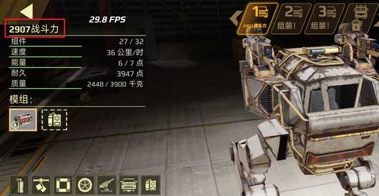 事實上,在實際游戲中,對戰(zhàn)的匹配很大程度上取決于戰(zhàn)斗力,在對局中會盡可能確保匹配到的是戰(zhàn)斗力相近的戰(zhàn)車。如下圖所示,在組裝戰(zhàn)車時會將所使用的所有部件的戰(zhàn)斗力累加,并顯示在裝配界面左上角的屬性面板上。而既然戰(zhàn)斗力如此重要,那么在給戰(zhàn)車選擇結構部件的時候,除了其自重以外,戰(zhàn)斗力也成了一個很重要的衡量標準。