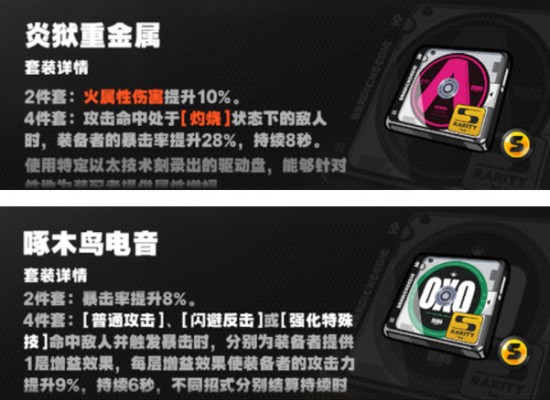 炎獄重金屬+啄木鳥(niǎo)電音二件套(火屬性傷害加成,暴擊率加成)