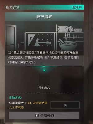當異常能量大于30,自動幫助玩家修復星塵諧振轉換器或者墻面結構等,類似于修復建筑耐久,家用收容物,異能評級越高,耐久恢復速度越快。清掃過程中可去收獲隨機素材。