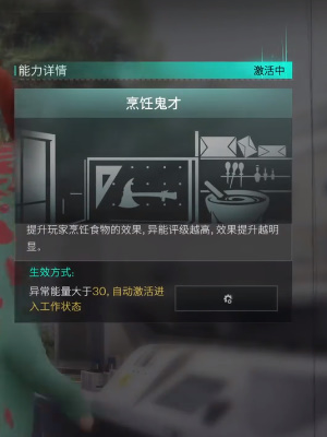 烹飪鬼才:異常能量大于30時,自動激活進入工作狀態(tài),幫助玩家進行烹飪并提升其對應效果,等級越高提升越大。