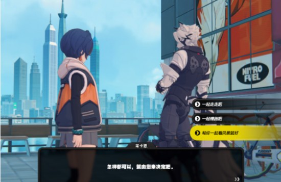 跟隨任務(wù)指引,在江邊找到萊卡恩,和他一起散散步吧。(此處選項(xiàng)隨意)萊卡恩的毛發(fā)被吹亂了,此時(shí)選擇“我?guī)湍阏戆?”,好感度提升!(難道狼哥喜歡摸摸毛!?),結(jié)束對(duì)話還會(huì)大幅度提升好感度!