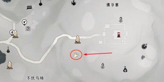 1.一聲見佛奇遇觸發(fā)地點位于佛爺寨和不伏馬場的交界處,具體的位置如下圖所示。