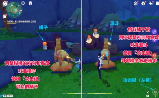 5、拾取橘子后,再次調(diào)整「柑橘」的方向和高度,將頭部對(duì)準(zhǔn)漏斗,使用「攻擊鍵」可將橘子放進(jìn)桶中。