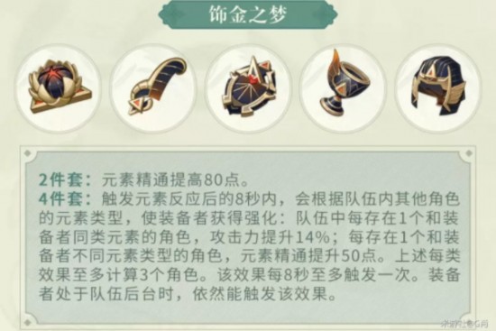 *妮露在綻放隊(duì)伍中往往只能作為副上水位,且為其天賦增益堆疊生命更重要,因此不太適配以精通/綻放類反應(yīng)增益為主的4飾金/4樂園,但這兩種套裝往往很適合隊(duì)伍中的主上水位,例如珊瑚宮心海、行秋等。