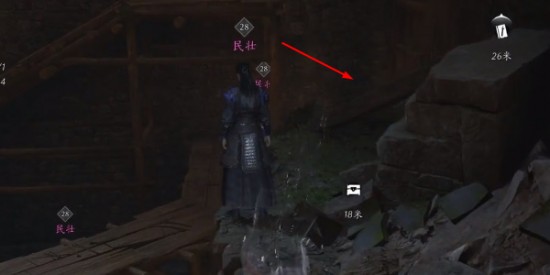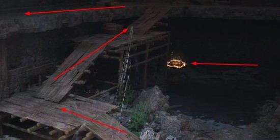 2.在密窟的一樓我們將出現(xiàn)的npc全部清理干凈,然后沿著圖中標(biāo)記的樓梯爬到木架上,然后往右側(cè)看可以發(fā)現(xiàn)一個(gè)寶箱。