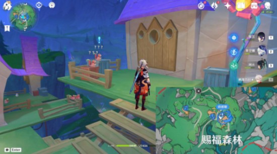 1、玩家傳送賜福森林北方向錨點(diǎn),前往樹屋頂位置接取任務(wù)(該錨點(diǎn)字樹屋定樓梯上)。