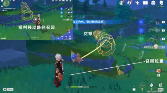 點(diǎn)按“T”,交互公主,之后長按攻擊,顯示軌跡穿過所有花環(huán),并命中花球,然后前往召回位置,顯示軌跡穿過所有花環(huán),預(yù)判移動(dòng)路徑點(diǎn)按攻擊召回。