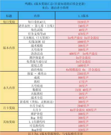 1.1版本可獲取的星聲和抽數(shù)如圖所示