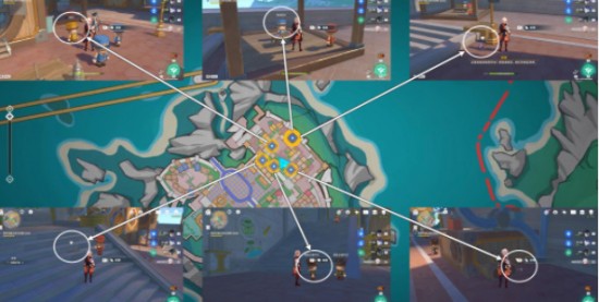 17.按圖中指引,前往6處位置調查和對話;分別拾取特殊礦鎬/衛(wèi)兵長矛/秘藥;分別對話星軌王城守衛(wèi)/店長/糧油店長,具體的位置如下圖所示。