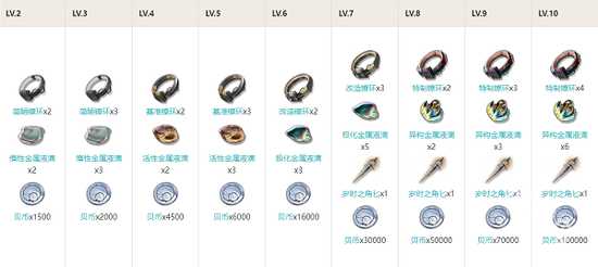 Lv10:特制鐐環(huán)x4+異構(gòu)金屬液滴x6+歲時(shí)之角匕x1+貝幣x100000