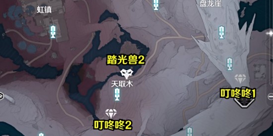 1.1新增的閃光異相聲骸踏光獸有兩處分布點(diǎn)位,分別在臥龍岡上方和天取木的右上角,具體位置如下圖所示。