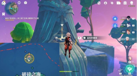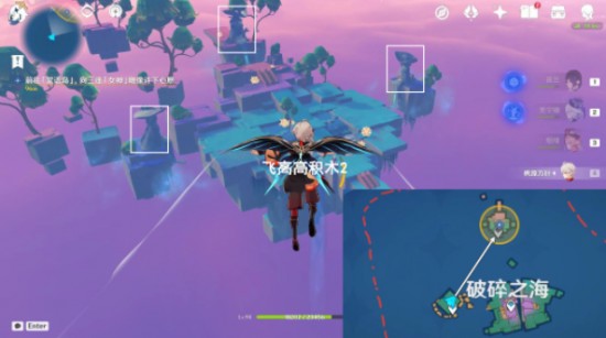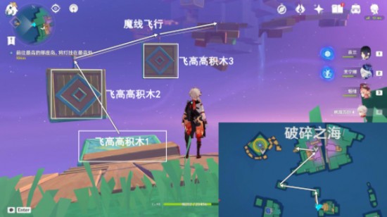 4、之后直接按著圖中指引路線走,可以利用“飛高高積木”,前往破碎之海,在這里開啟破碎之海中間錨點(diǎn),前往懸崖位置;