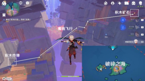 10、然后傳送破碎之海中間錨點(diǎn),往礦窟中間裂縫下飛,直接按圖中指引路線走,拾取“積木炸彈”,利用“魔線飛行”,前往安裝于“積木礦石”上;