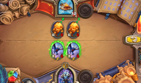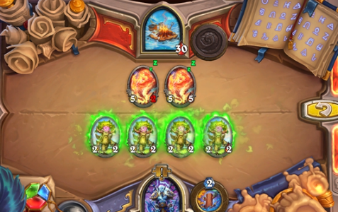 首先對(duì)最左側(cè)的烈焰元素使用打3法術(shù),再召喚4個(gè)突襲樹人換掉場(chǎng)上隨從。