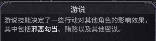 1、從游戲中可以看到技能描述:游說(shuō)技能決定了一些行動(dòng)對(duì)其 他角色的影響效果,其中包括邪惡勾當(dāng)、賄賂以及其他密謀。