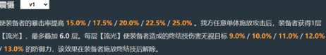 使裝備者的暴擊率提高15.0%/17.5%/20.0%/22.5%/25.0%。我方任意單體施放攻擊后,裝備者獲得1層[流光] ,最多疊加6.0層。每層[流光]使裝備者造成的終結(jié)技傷害無視目標(biāo)9.0%/10.0%/11.0%/12.0%/13.0%的防御力,該效果在裝備者施放終結(jié)技后解除。