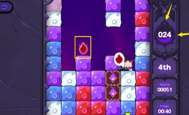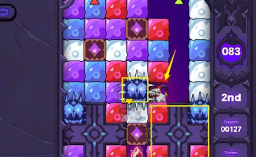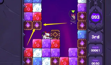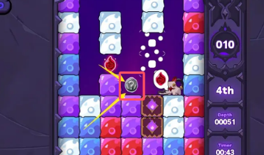4、被上方掉落方塊壓住會(huì)死亡,藍(lán)色帶刺方塊無(wú)法消除且被攻擊會(huì)死亡深紫色方塊也無(wú)法消除下圖中的黃色框框處。